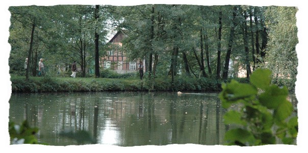 Wassergraben befindet, der die Wiese von dem Waldstück trennt.