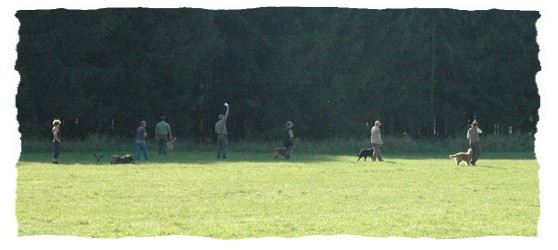 jeweils links gehende Hundeführer seinen Hund zum Buschieren
